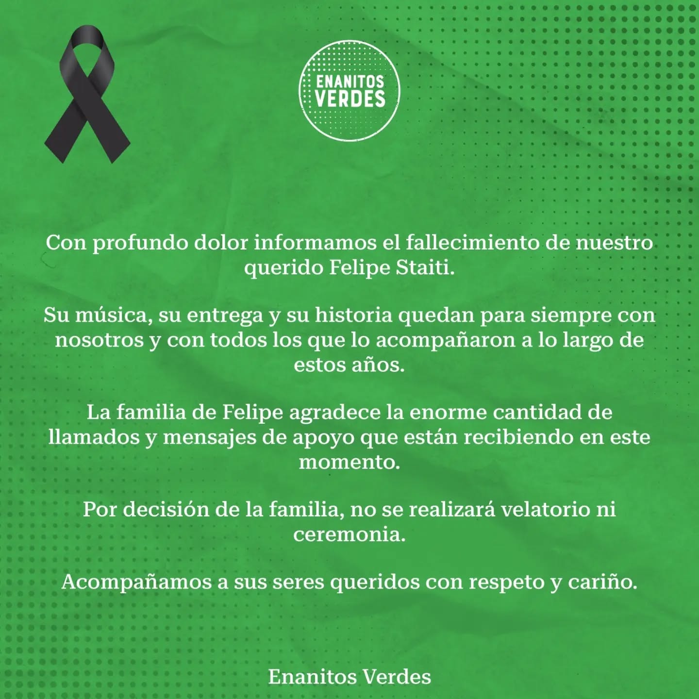 Lamentamos informar el fallecimiento de Felipe Staiti, fundador de Enanitos Verdes, a los 64 años. La noticia fue confirmada por su círculo cercano, tras haber sido internado en el Hospital.