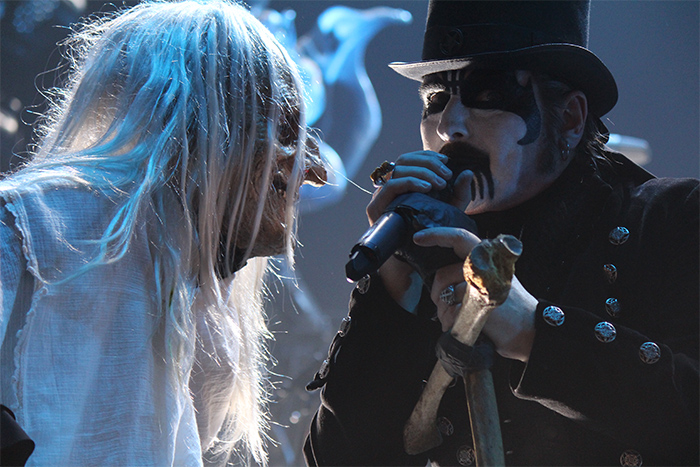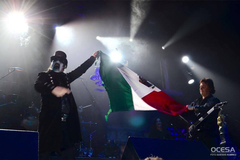 Finalmente el telón, como un fantasma que se desvanece cae para por fin ver la tétrica escenografía de cruces invertidas, gárgolas y un pasillo del horror con dos escaleras e imágenes proyectadas en la pared de ese pasillo junto con un pentagrama gigante (característico del rey en sus presentaciones). La eufória había llegado a su máximo esplendor cuando miles de voces estallaron en gritos y lágrimas, KING DIAMOND estaba en el escenario. “Welcome Home” con toda su furia arremetía a un público loco de la emoción, se podía ver la cara de nuestro querido Kim como diciendo “aquí estoy para ustedes, el rey ha llegado” con notorio entusiasmo, recorriendo el escenario de punta a punta como la más enfurecida alma en pena. “Sleepless Nights” continuó con el espectral espectáculo donde las almas danzaban envueltos en la katársis auditiva que ésta banda de culto generaba, además de una actuación impresionante, porque esto no era tan solo un concierto y todos lo sabíamos, sino de un show de horror que enchinaba la piel. Fue cuando “Halloween” infaltable en el setlist nos sumergió en la oscuridad total, seguida de “Eye Of The Witch” para que la fiesta del infierno cortejara las ánimas más impuras y tenebrosas. Llegó el momento donde la euforia y las lágrimas eran una sola cosa (yo personalmente no pude evitar el llanto de emoción) pues “Melissa” nos era dada como un regalo tan bello de esos que atesorarás para toda la vida, algo que difícilmente puedas compartir con alguien más porque es tán íntimo como uno mismo.