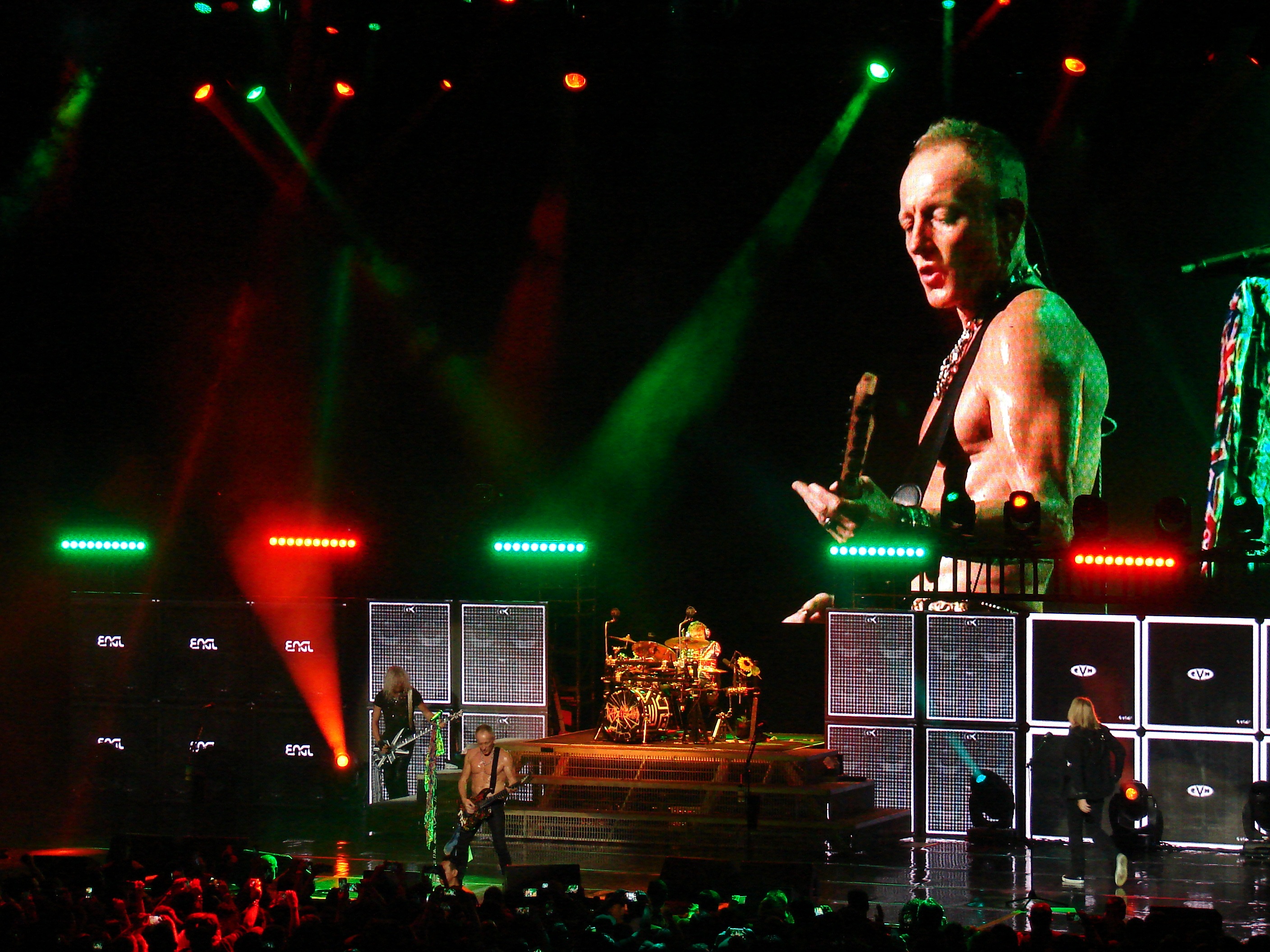 Después de una larga espera el momento que todos estábamos esperando por fin ha llegado, la banda inglesa DEF LEPPARD llega a Guadalajara, el Auditorio Telmex se encarga de recibir a los hijos de la noche quienes desde muy temprana hora llegaron al recinto para hacer una enorme fila y poder ingresar lo más pronto posible, algunos llegaron con la esperanza de poder ver a su banda favorita en el soundcheck, otros buscaban llevarse algún recuerdo, cabe mencionar que entre el público se encontraban niños, personas mayores y no podían faltar los que tuvieron la suerte de disfrutar en todo su esplendor los años 80´s, portaban camisetas, mantas, banderas, y todo lo que pudieron ingresar alusivo a la agrupación para hacerles sentir el enorme cariño que sienten sus fans por ellos, transcurre el tiempo y como buenos ingleses, puntual comienza el show, una gran sorpresa nos aguardaba, ya que de principio a fin un despliegue de luces, pantallas gigantes y un sonido sin igual dieron marco a un espectáculo que dejaría a los asistentes maravillados, al momento que salió la banda solo se podían escuchar gritos de emoción, la banda que siempre soñamos ver ya era una realidad, frente a nuestros asombrados ojos se encontraba DEF LEPPARD¡