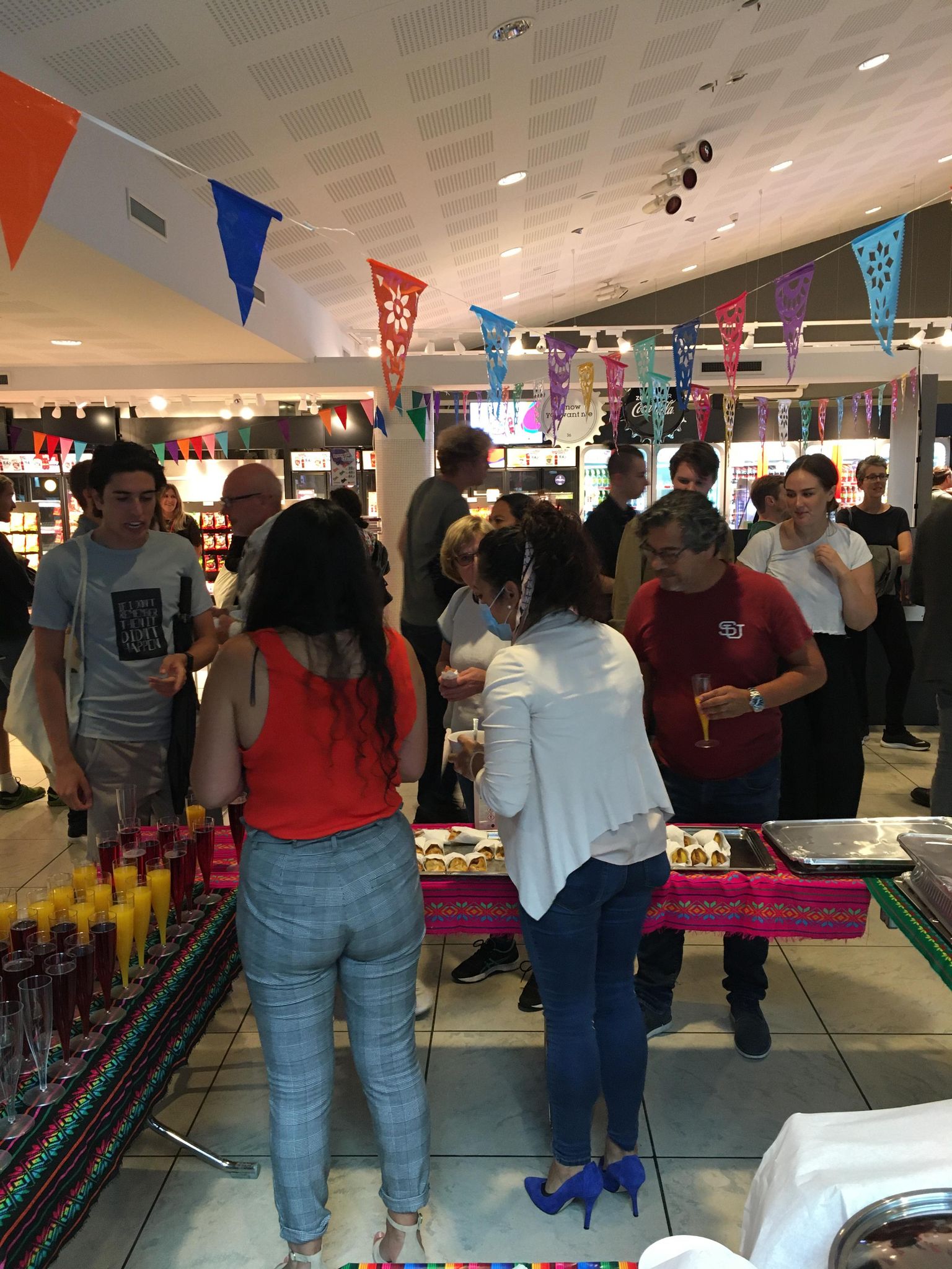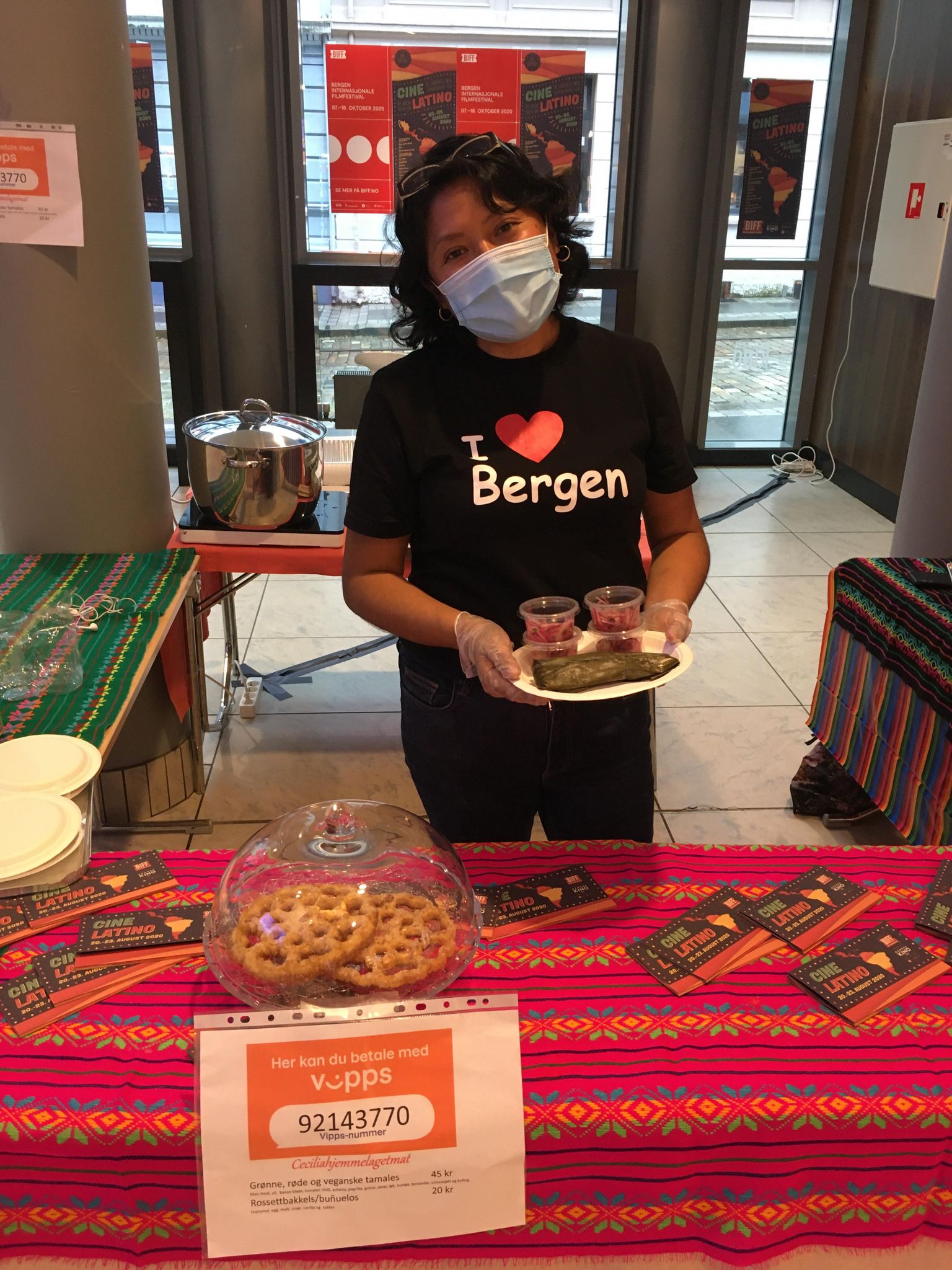 El festival estuvo lleno de la cultura latina desde sus colores con los adornos que invitaban a entrar a curiosear después de leer en ese hermoso letrero “CINE LATINO”. Además de ver nuestro cine latino, también hubo la rica gastronomía por supuesto latina a cargo de Kuyay Kafé Júlia Catalina Solorzano (Bolivia) , Marlene Hidalgo Vigo (Perú) y Cecilia Enríquez (México) hjemmelagetmat. Tres latinas que gustan de compartir los sabores de sus salteñas, tamales y sándwiches de chicharrón, así como de deliciosos postres como los alfajores y buñuelos. Si el colorido no te hacía entrar, el olor a café peruano y mexicano ya no te dejaba duda alguna para hacerlo. Por otra parte, la música fue un factor alterno al cine y ala rica gastronomía, motivo por el cual los asistentes se mostraron interesados y más cuando se entonaban melodías que invitaban al baile. Las famosas cuecas, bailes andinos y sones mexicanos a cargo de los grupos de danza CUECAS BERGEN, TAKIRI y MEXICO LINDO. Todo esto aderezado por el sentimiento musical de CARLOS “EL INKA” con la melodía de su flauta, quien nos transportó a la tierra añorada.